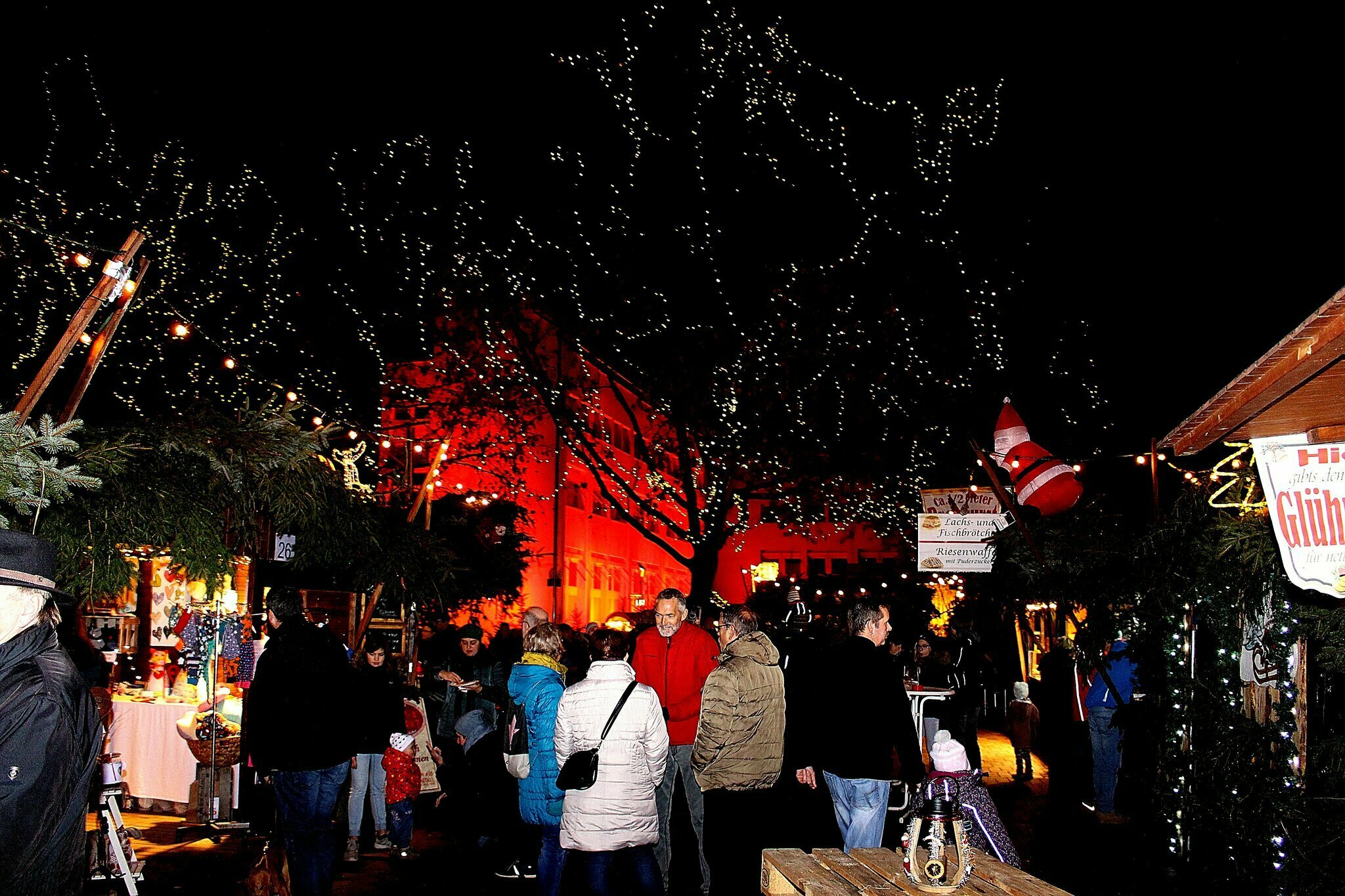 Die Budenstadt auf dem Weihnachtsmarkt lockt wieder mit einem bunten Angebot an Genuss- und Verkaufsständen. Kunsthandwerk, Wolle und weihnachtliche Dekorationsartikel sind an den Ständen zu entdecken. Dampfnudeln, Flammkuchen, Pizza, Süßwaren, Crêpes, Churros, Gegrilltes und vieles mehr stillen den Hunger zwischendurch – und auch ein reichhaltiges Glühweinangebot und diverse andere leckere Heißgetränke mit und ohne Alkohol dürfen auf dem Weihnachtsmarkt der 1000 Lichter” nicht fehlen. Für die kleinen Besucher stehen auf dem Haßlocher Weihnachtsmarkt zwei Kinderkarussells zur Verfügung und auch das Stockbrotbacken am Lagerfeuer ist für viele kleine Gäste ein Highlight.